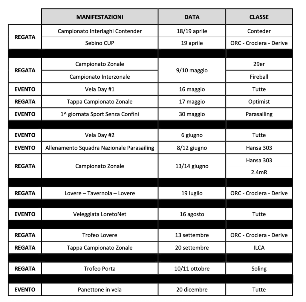 Tutti gli anni da febbraio a novembre il calendario dell’Associazione Velica Alto Sebino è molto fitto: dalle regate zonali alle tappe nazionali dei circuiti di varie classi veliche; dalle classiche regate storiche come la “Lovere-Tavernola-Lovere”, alle regate sociali “Sebino Cup”, agli eventi inclusivi come la giornata dello “Sport Senza Confini”: un momento di festa per veleggiare in compagnia e ritrovarsi.